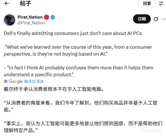 戴尔产品负责人凯文·特威利格(Kevin Terwilliger)在接受PC Gamer采访时表示:“我们非常注重设备的AI能力——事实上,我们即将发布的所有产品都配备了NPU——但今年我们发现,尤其从消费者角度来看,他们购买PC并非基于AI。AI反而可能让他们感到困惑,而非帮助他们理解具体价值。”