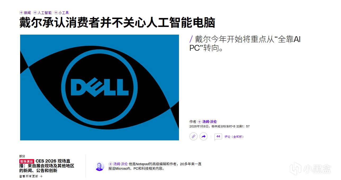 在CES 2026开展前夕,戴尔公开承认,消费者目前并非因AI功能而购买PC。该公司正调整2026年产品策略,不再将“全AI PC”作为核心卖点。