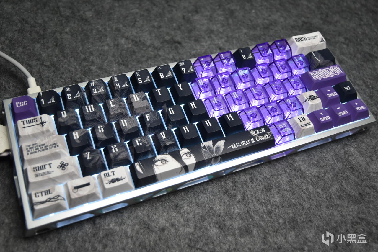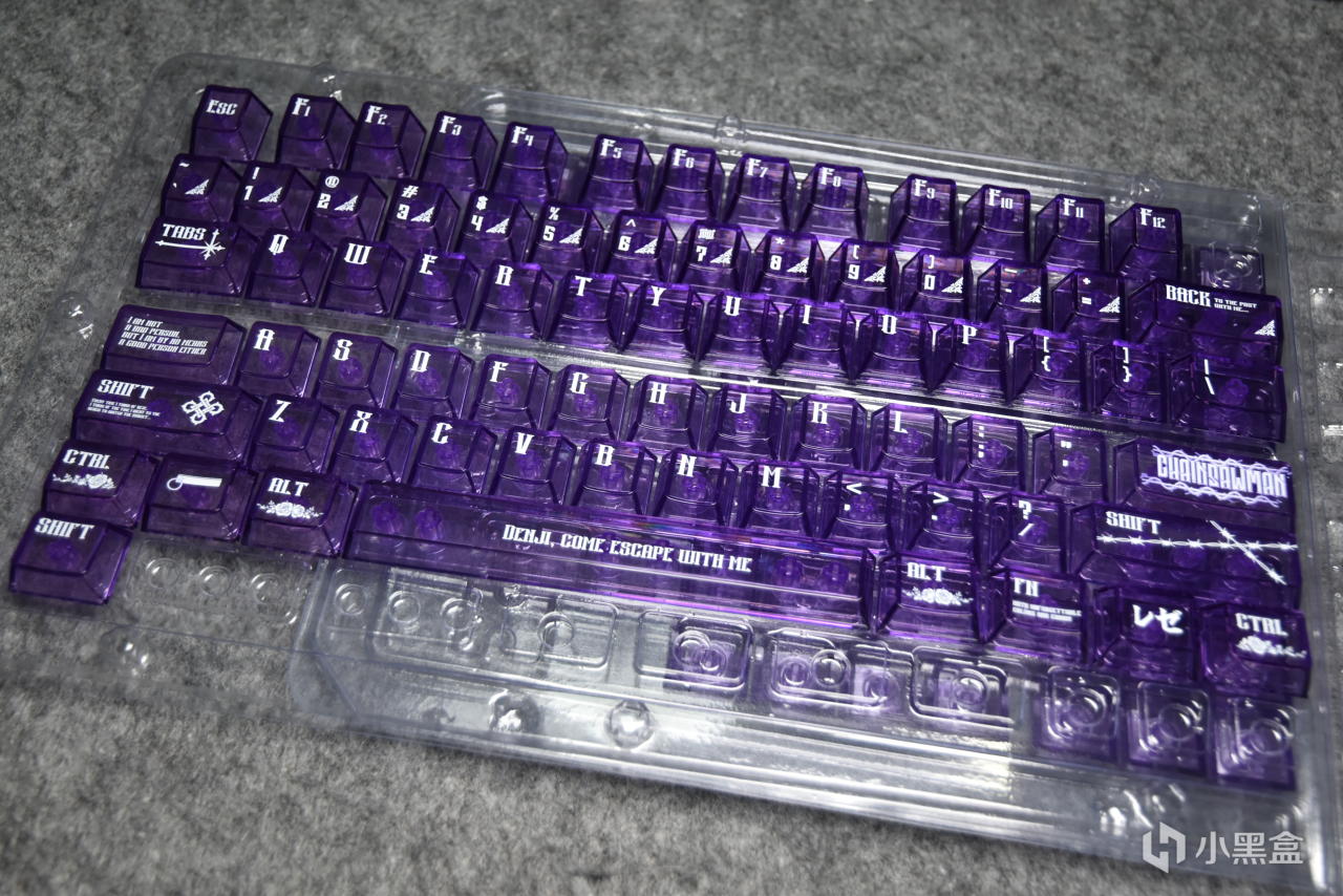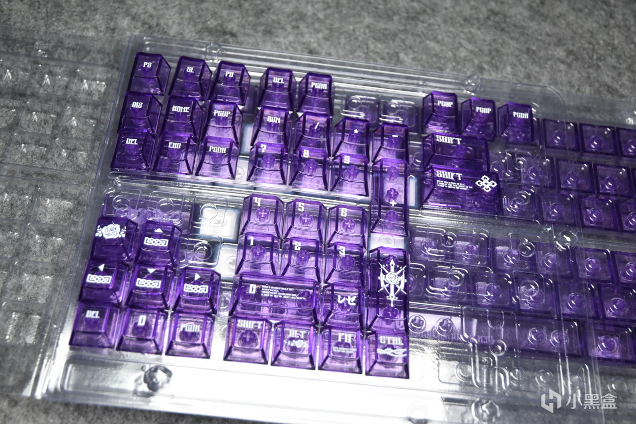 PC键帽共有123颗,采用了与蕾塞相对应的紫色配色,有着不错透光性的同时,又不会像白透那样耀眼,同时还韵味十足。不过PC材质手感稍显光滑,可以放在一些不常用的按键上。