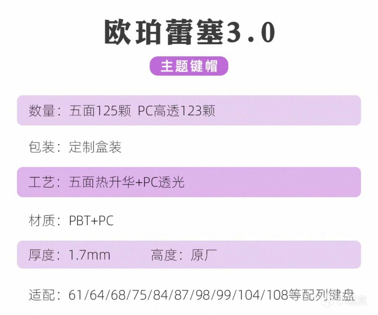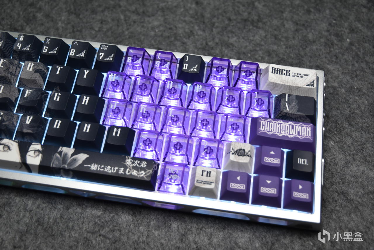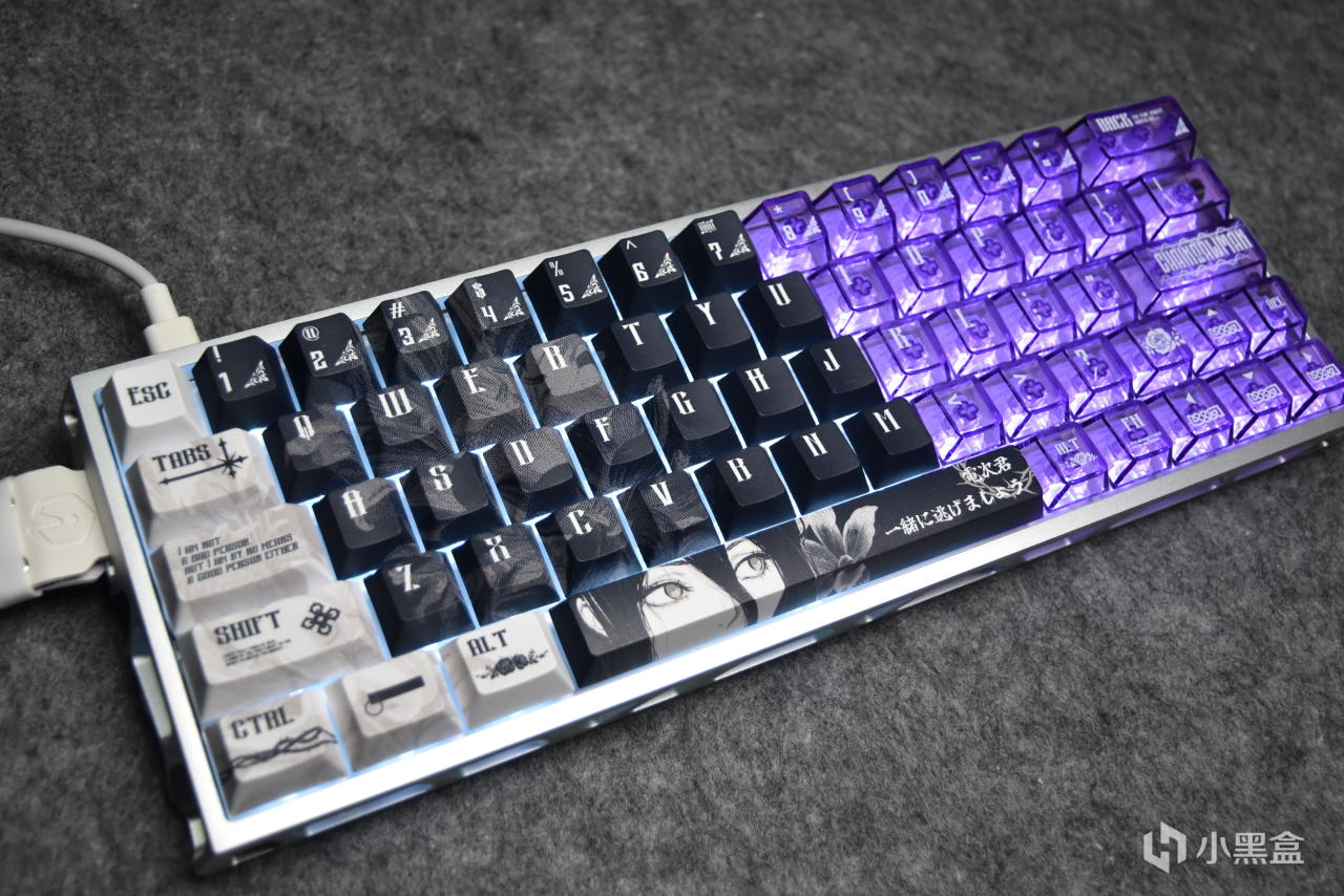 PC键帽共有123颗,采用了与蕾塞相对应的紫色配色,有着不错透光性的同时,又不会像白透那样耀眼,同时还韵味十足。不过PC材质手感稍显光滑,可以放在一些不常用的按键上。