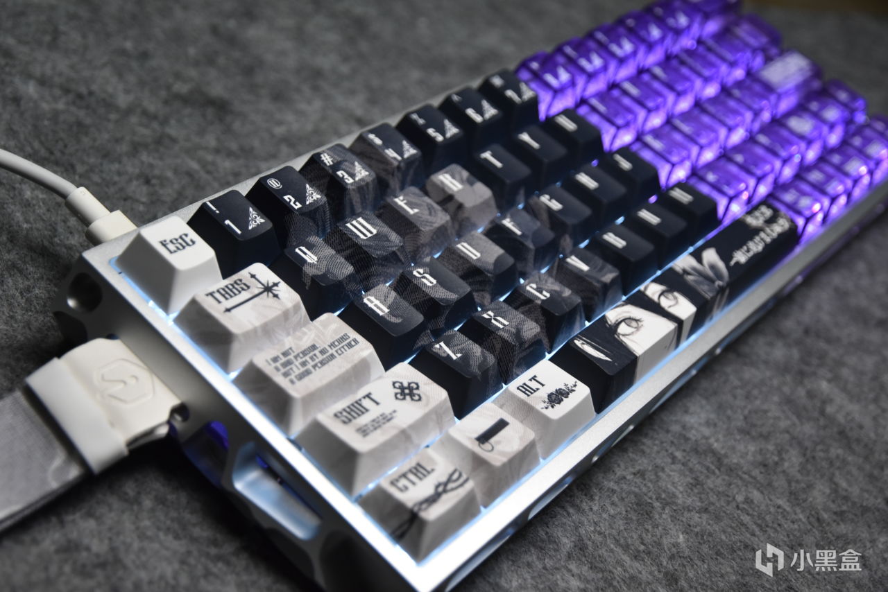 键帽以黑白配色为主,在黑白两种色系的键盘上,都有着不错的颜值表现,再点缀一些紫色键帽,会让人有种眼前一亮的感觉。
