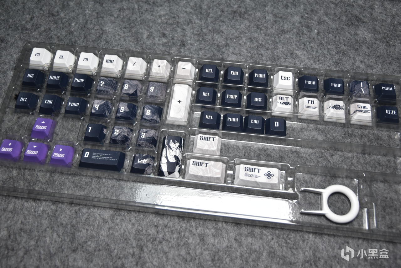 PBT键帽采用了五面热升华工艺,从键帽清晰的纹理细节和字符上,我们可以感受到这种工艺的优势,另外PBT的材质也让键帽更加耐用,防止了时间一长键帽打油影响颜值的情况。键帽表面还有磨砂感,可以起到不错的防滑效果,游戏玩家用起来应该会非常喜欢。另外键帽共125颗,分上下两层置于包装盒内,下层还附赠有一个拔键器。