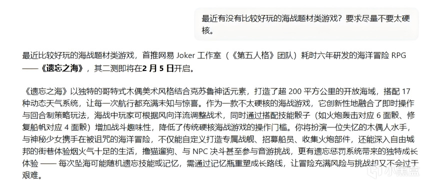 最近无意见刷到了《刺客信条 4:黑旗》重制版的最新消息,育碧的"新年贺词"又把我们这些老粉们钓成翘嘴了。不过话说回来近两年海战题材的新游并不常见,之前玩过育碧旗下的《碧海黑帆》,虽然对我来说是个及格的作品,但是被简化的陆地活动以及不能登船进行剑术对战的操作,总觉得少了点什么。于是我就在想,有没有一款既能在海上掠夺,又能在陆地打架,还能休闲放松的航海类游戏呢?问了下 AI,没想到给我推荐了一款即将二测的新游 -《遗忘之海》。