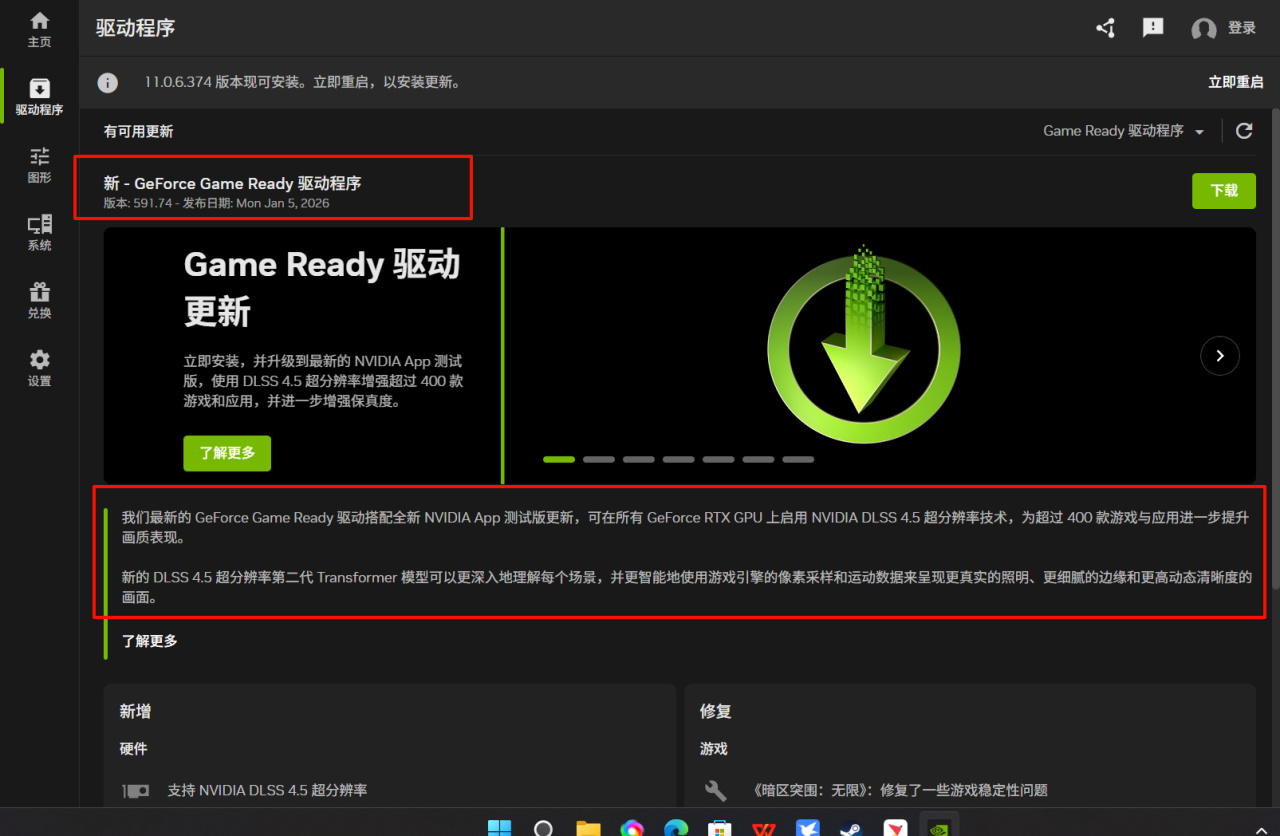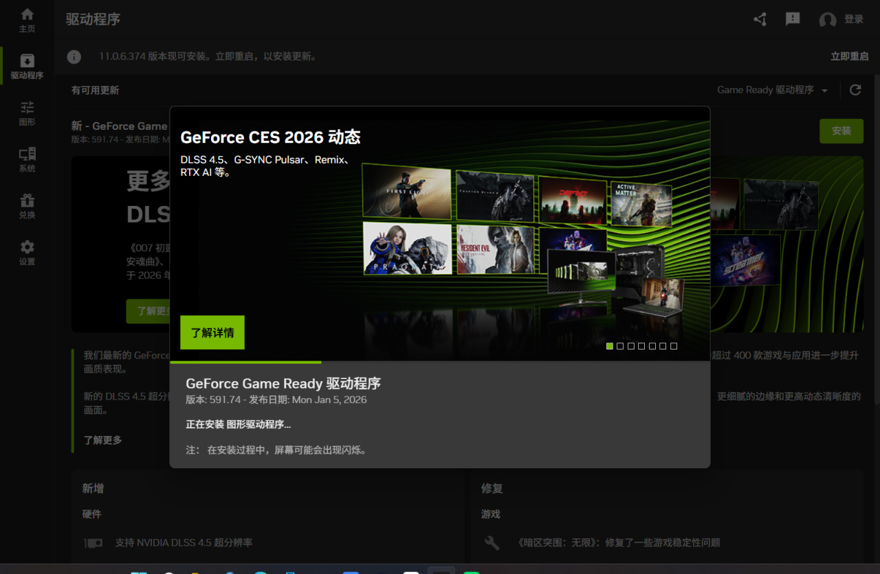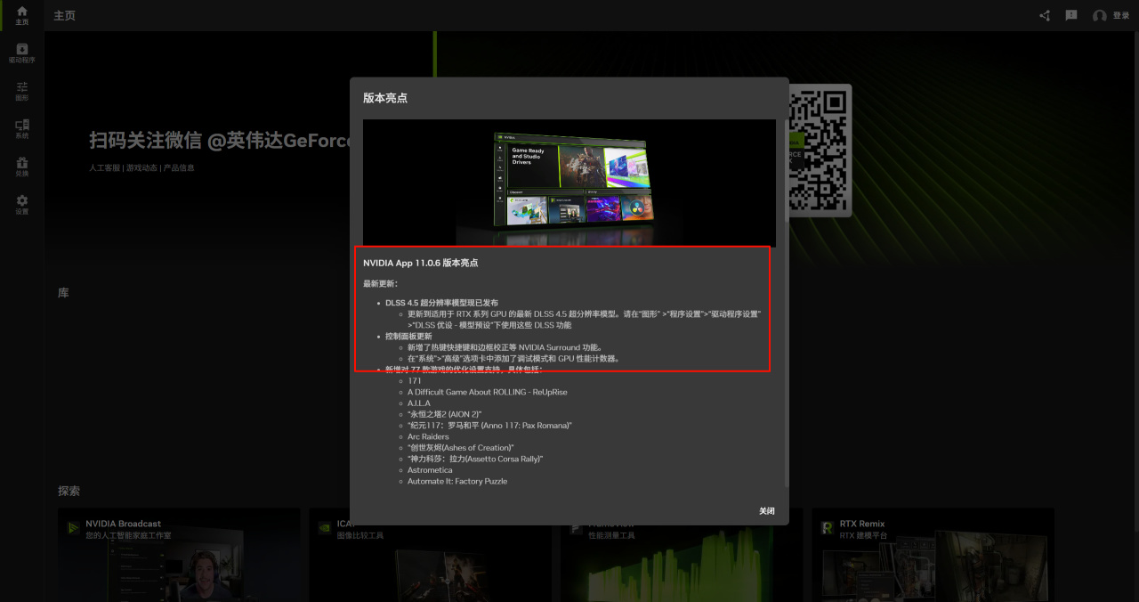 装好驱动后,重启NVIDIA APP。重启之后,你就可以看到它的标识写了11.0.6的版本亮点,支持DLSS 4.5。
