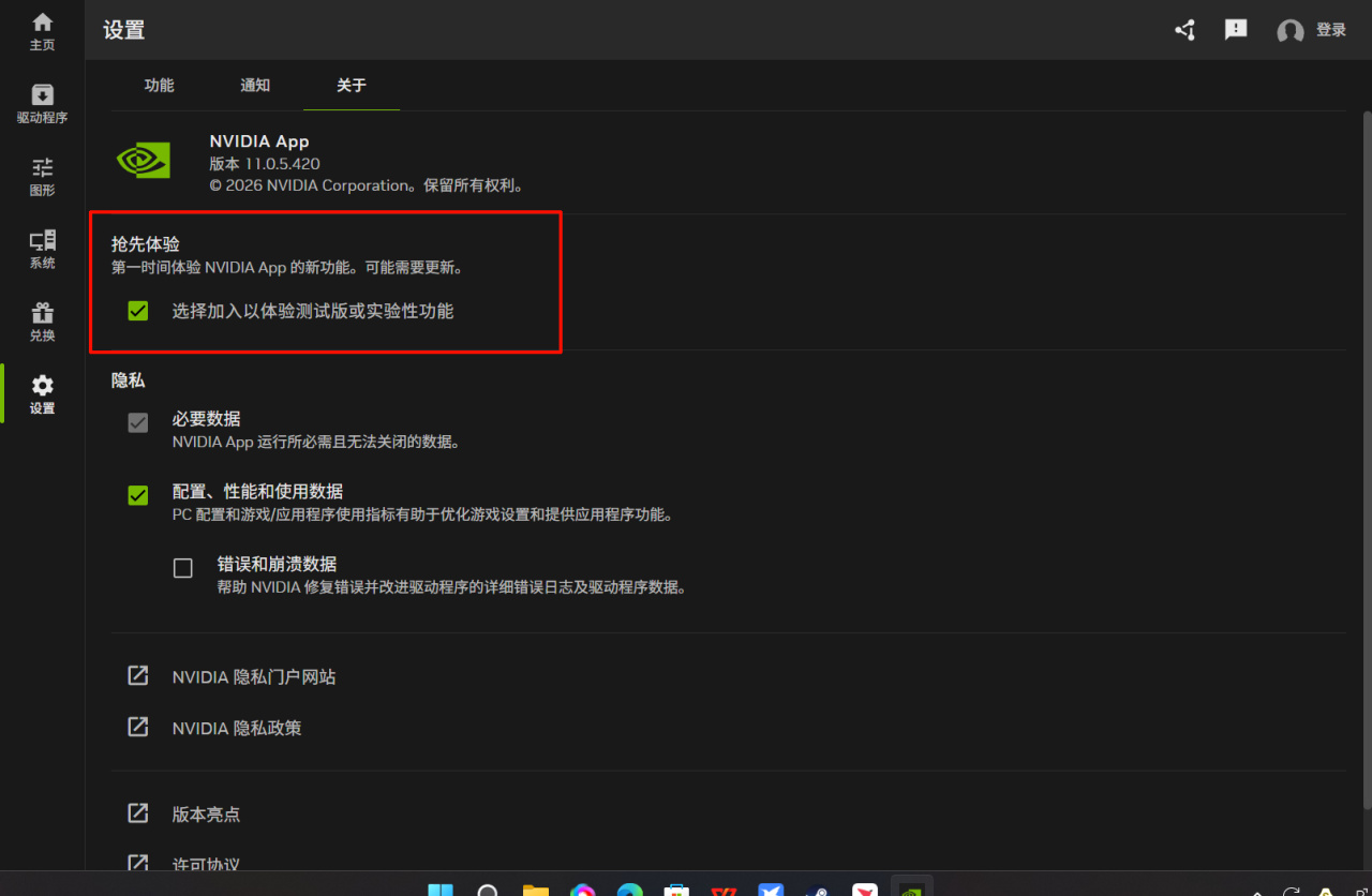 在NVIDIA APP的“设置”里找到“关于”,勾选 “选择加入以体验测试版或实验性功能”