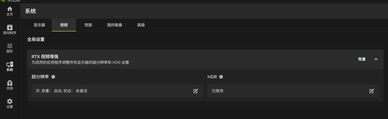 哦,对了,顺带一提,之前一直心心念念的RTX VSR视频超分辨率功能,还有自动HDR功能,在NVIDIA APP的“系统”选项卡的“视频”设置里面。