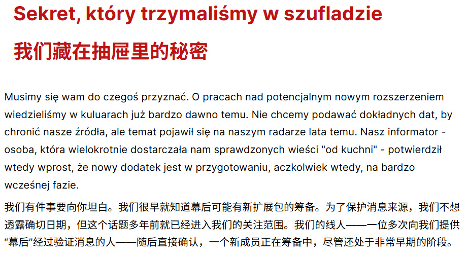 继波兰游戏知情者博里斯·涅谢皮瓦克与诺布尔证券分析师马特乌什·赫扎诺夫斯基(二人近期均重申判断)的表态后,IGN波兰投下震撼弹:该媒体"早已获知"传闻中的DLC情报。