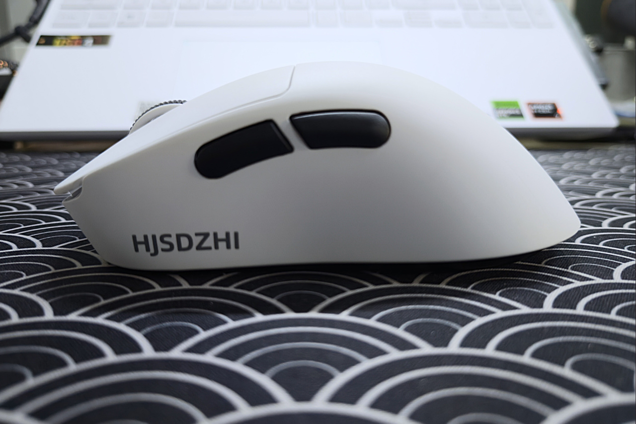 通体纯白的机身简约利落,镜面材质手感也不错,虽然不如几百块的大厂涂层那么细腻,但在防滑和抗油光方面做得还不错。它的Logo“HJSDZHI”印在左侧裙位置,灰色的字体在白色机身上不突兀,整体视觉效果很协调。对于喜欢极简风的玩家来说,这个颜值绝对是及格线以上的。