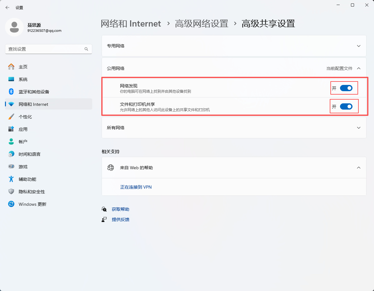 4、在高级共享设置窗口的“公用网络中”,将“网络发现”和“文件和打印机共享”两个选项右侧的开关都打开。
