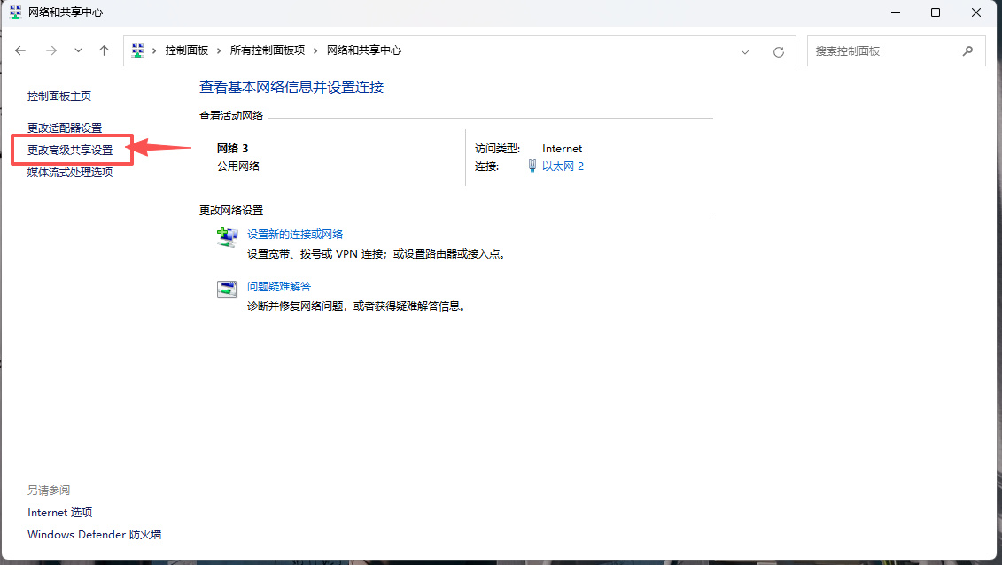 3、在左侧栏目,点击“更改高级共享设置”。