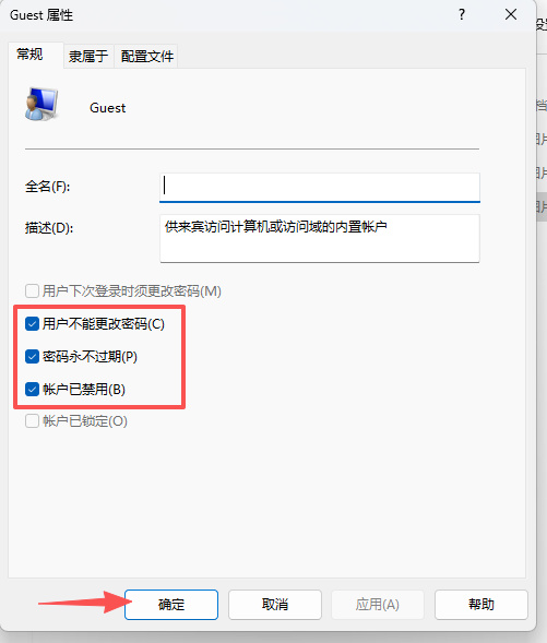 3、勾选“用户不能更改密码”、“密码永不过期”和“账户已禁用”,再点击下方的“确定”。