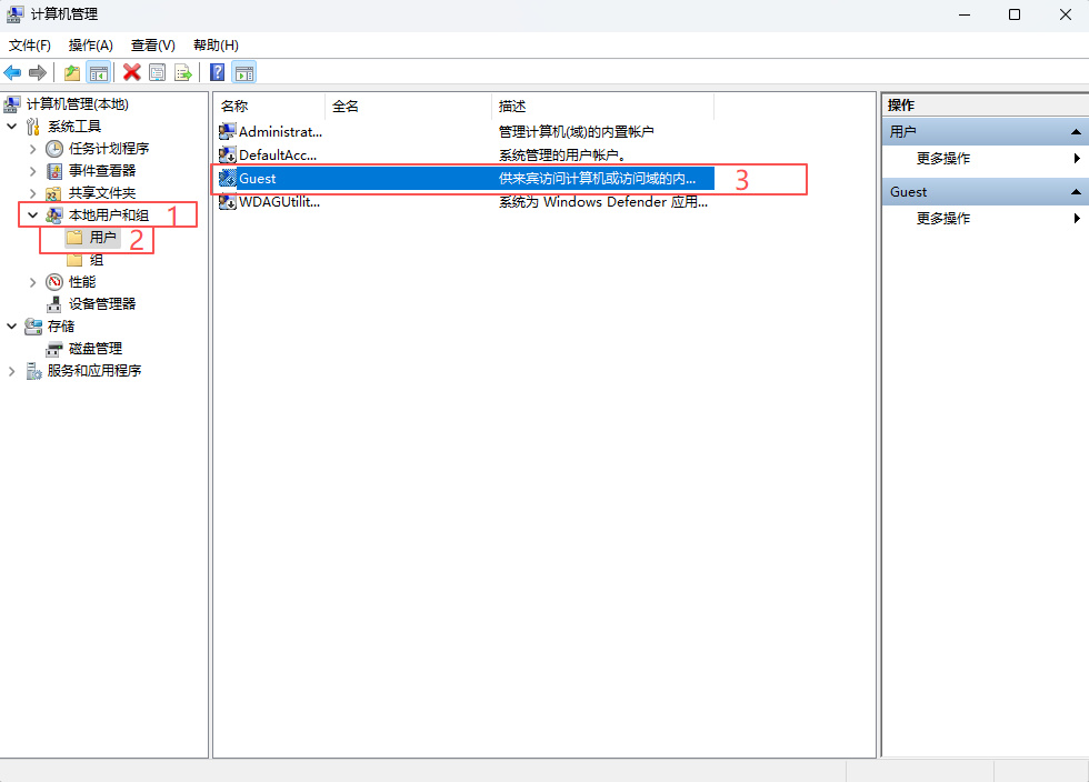 2、在计算机管理窗口的左侧点击展开“本地用户和组”,再选择“用户”,右侧找到并双击打开“Guest”。