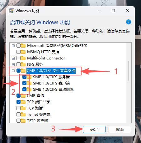 3、在打开的Windows 功能窗口,找到并双击“SMB 1.0/CIFS 文件共享支持”选项,并勾选SMB 1.0/CIFS 文件共享支持下的三个选项,然后点击确定,并重启电脑。