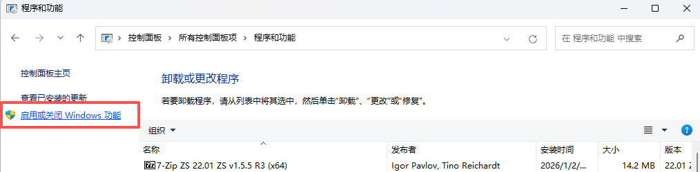 2、在左侧栏点击“启用或关闭 Windows 功能”。