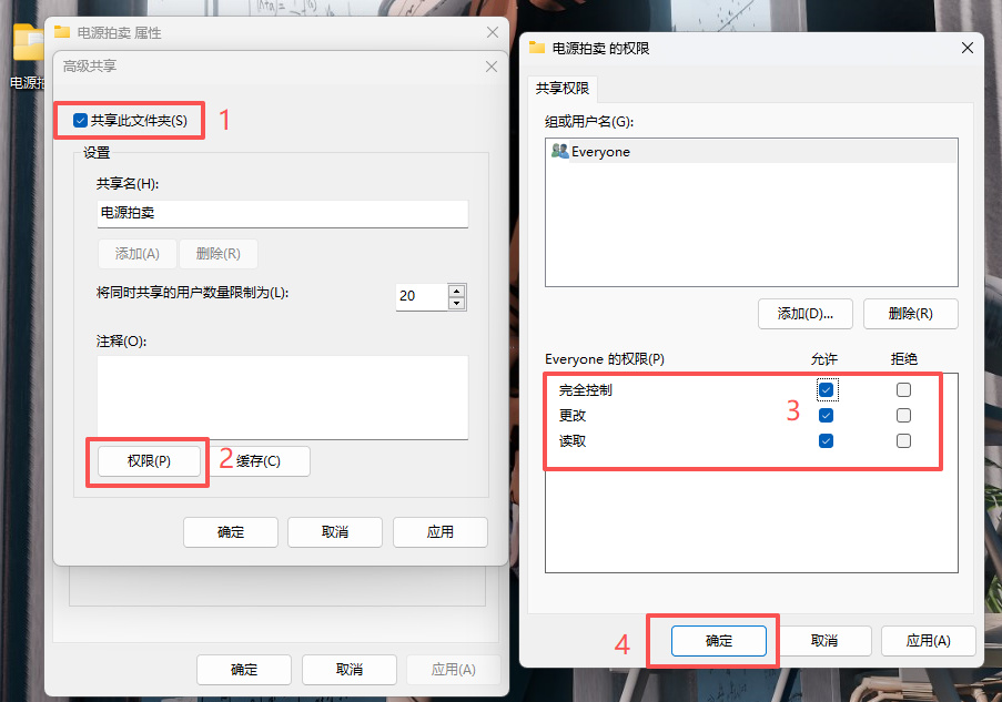 3、高级共享窗口,勾选“共享此文件夹”,点击“权限”,将 “完全控制”、“更改”、“读取”的权限全部更改为“允许”。