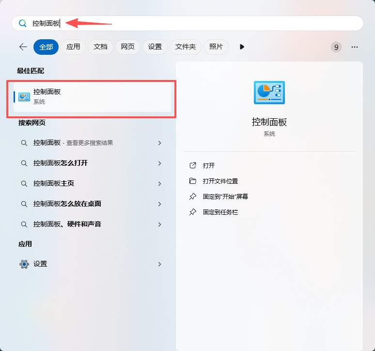 1、按“Win + S” 组合键,或者鼠标右键点击开始图标,选择搜索,在搜索框中输入“控制面板”,单击将其“打开”。