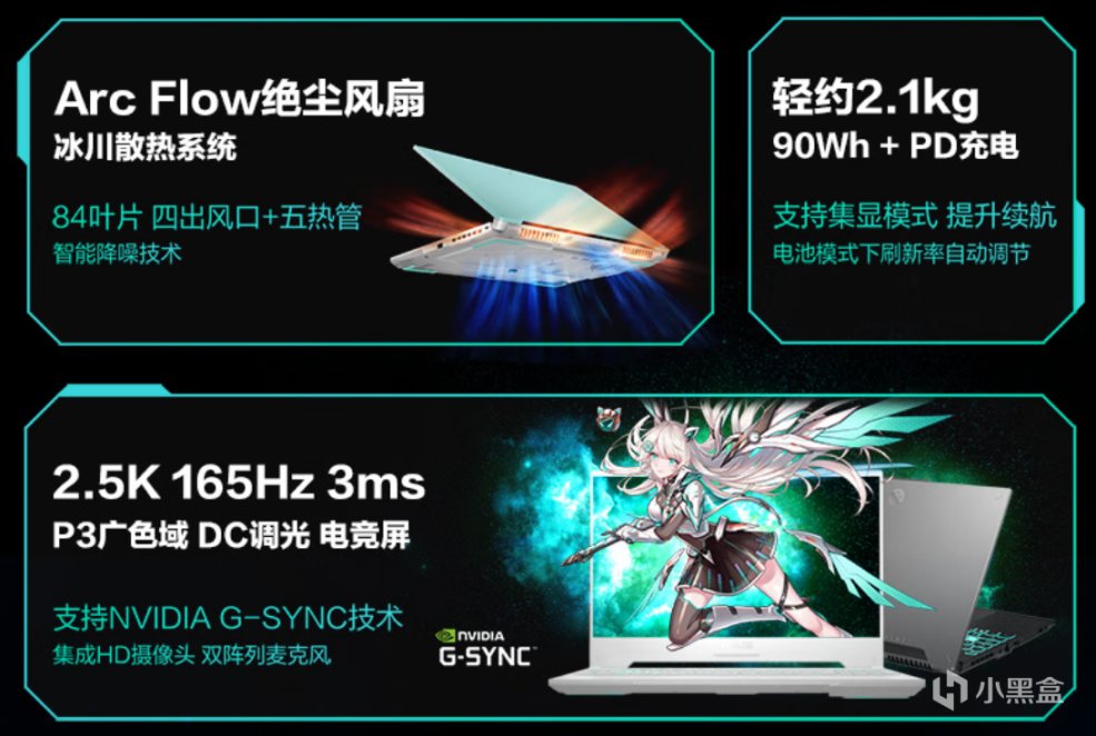 在散熱規格上,筆記本內置的冰川散熱架構,由雙84葉片Arc Flow絕塵風扇+四出風口+五熱管組成,支持智能降噪技術。