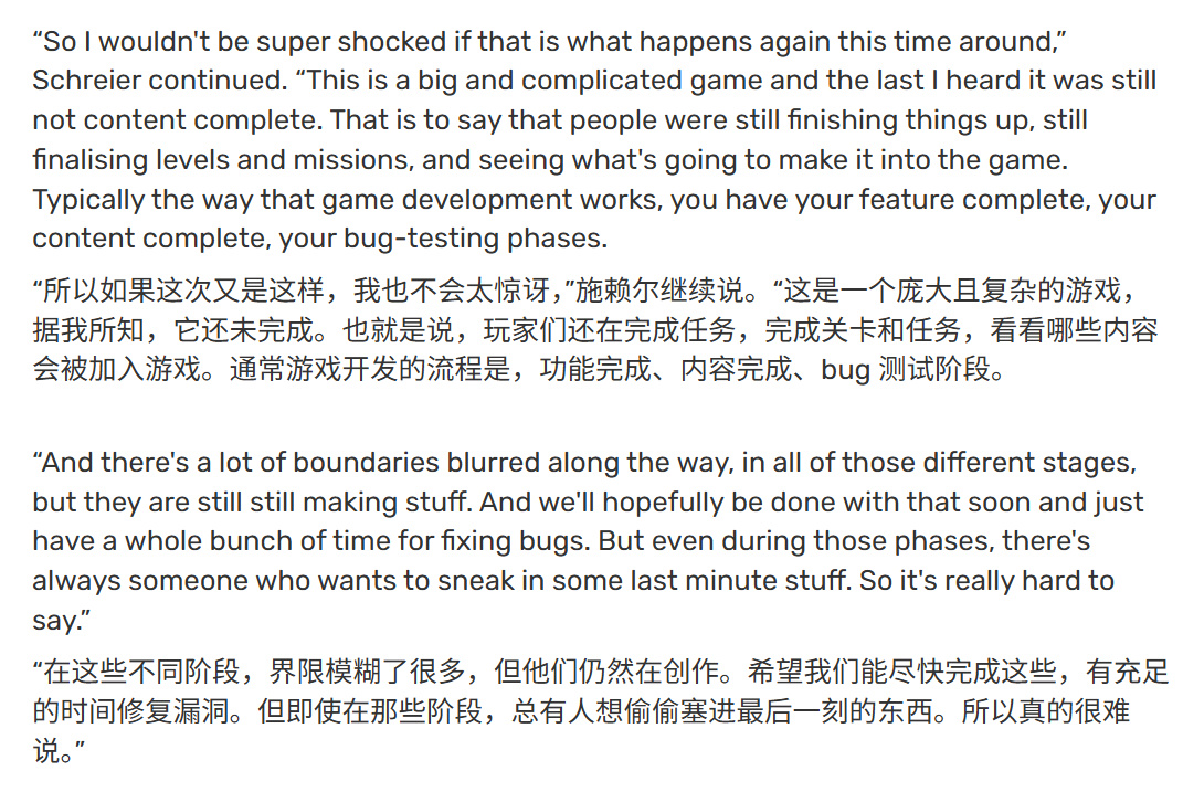 雖然施雷爾未透露何時獲知遊戲尚未內容完成的消息,但他描述目前仍處於開發人員完善遊戲各層面的階段,包括關卡任務設計及整體潤色。儘管如此,他認爲當前設定的2026年11月發售窗口比去年公佈的2025年秋季"更具實感":"據我最新瞭解,遊戲仍未內容完成。這意味着團隊仍在收尾工作,完善關卡任務並確定最終內容。目前很難斷言發售日期,R星無人能100%保證11月發佈,但這比2025年秋季的感覺更現實些。"