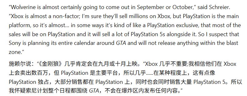 谈及PS5独占游戏《漫威金刚狼》潜在发售档期,施雷尔认为索尼与失眠组很可能瞄准9-10月窗口,以远离当前定于11月19日发售的《GTA6》,确保R星巨制不影响其销量:"《金刚狼》几乎确定在9-10月发售。Xbox平台影响微乎其微;虽然Xbox版销量可达数百万,但PlayStation仍是主力平台,某种程度上这就像PS独占游戏——主要销量来自PS平台,并将带动大量PS5主机销量。因此我推测索尼正围绕《GTA6》规划全年档期,避免在冲击范围内发行任何作品。"