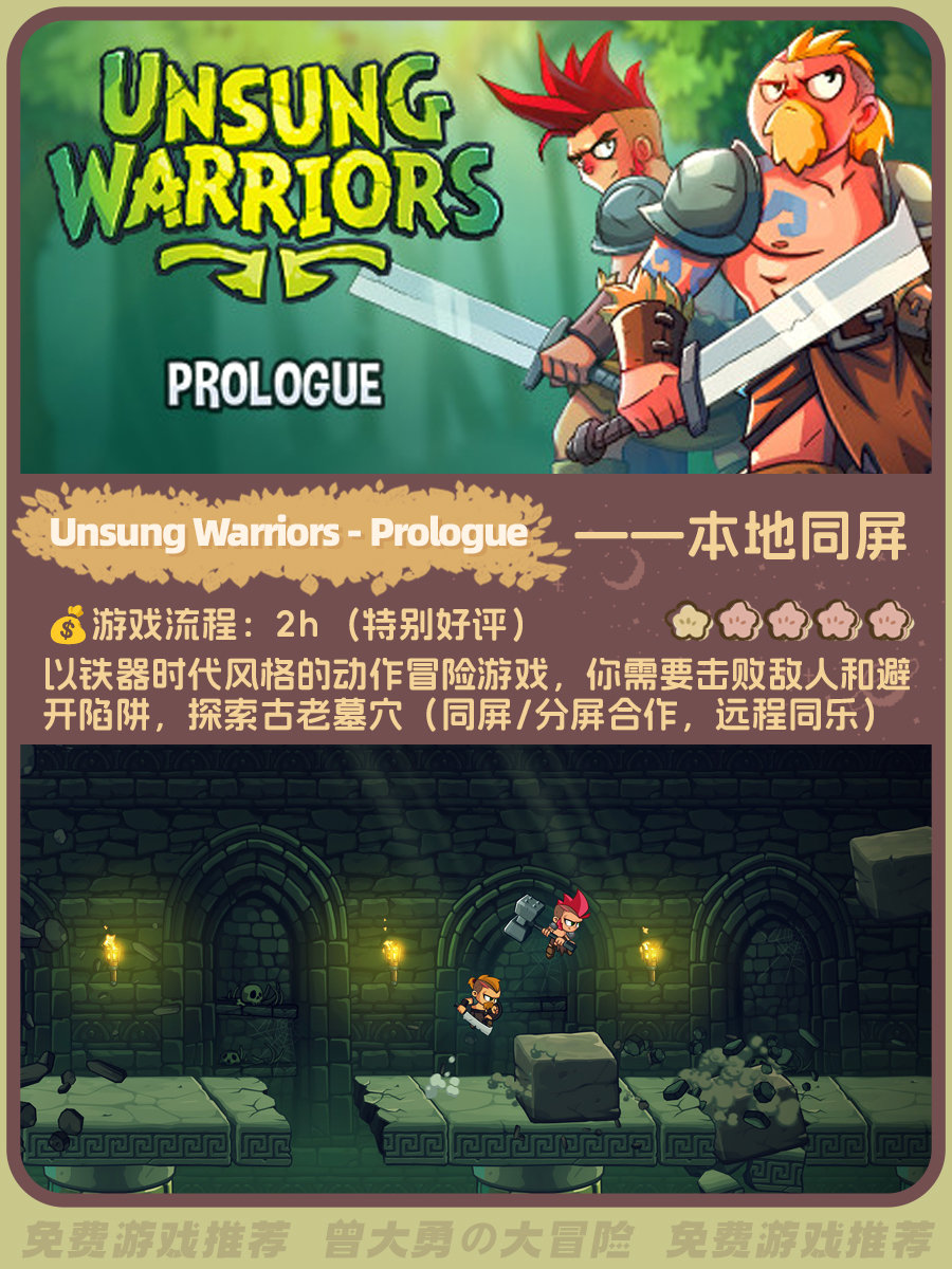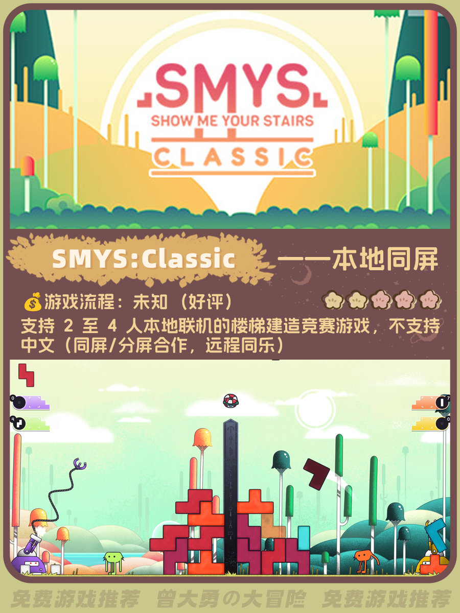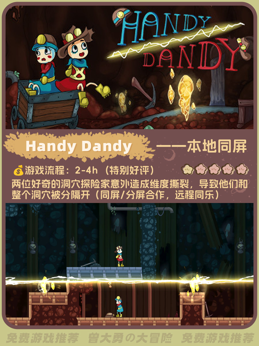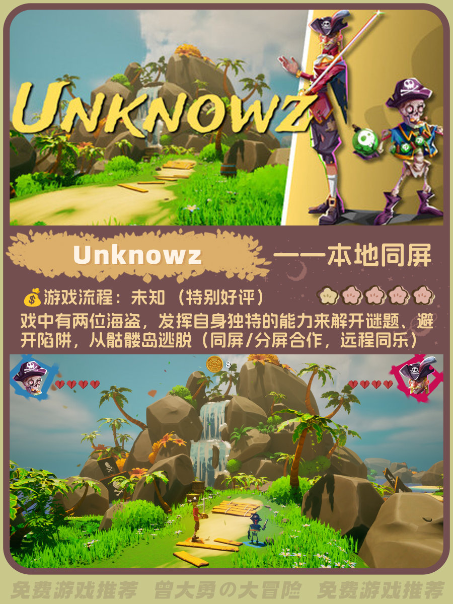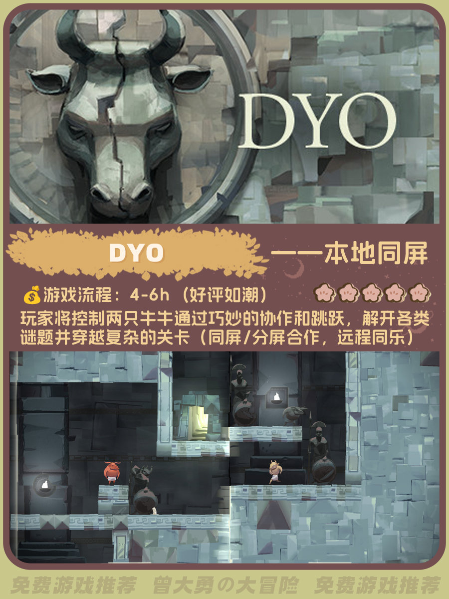 整理了一下超多好评的免费双人游戏,大部分是本地同屏游戏。图里包含流程时长、玩家评分、游戏概述(星级是根据好评度给出)