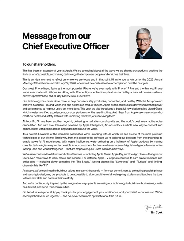 我谨代表苹果全体员工,感谢各位的参与、信任与对我们使命的支持。我们已携手取得诸多成就——而我对未来也从未如此乐观。