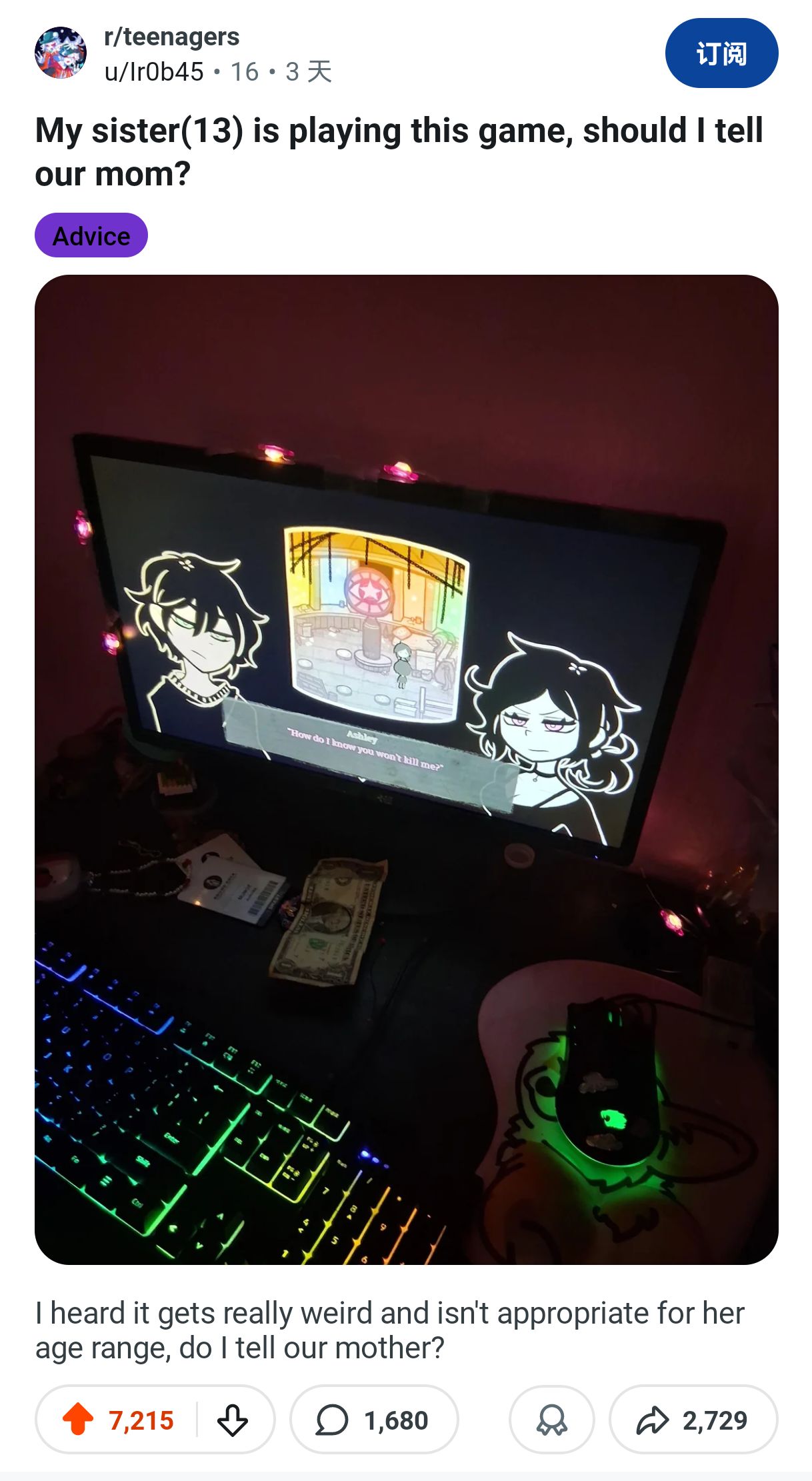 在Reddit上,一位哥哥向玩家社区求助,因为他发现自己的妹妹最近正在玩“安迪与莉莉的棺材”,他焦急的向网友询问【我妹妹(13岁)在玩这个游戏,我该告诉妈妈吗?】