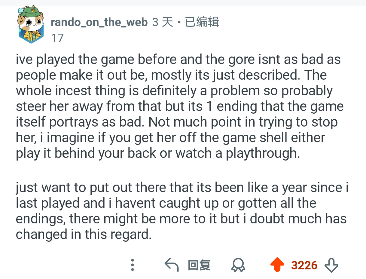 我以前玩过这游戏,血腥场面没传说的那么严重,大多只是文字描述。 “德国骨科”内容确实是个问题,最好让她避开,但那只是游戏里被描绘成坏结局的一条支线。 想办法阻止她没什么意义,我估计就算你让她别玩,她要么背着你偷偷玩,要么去看实况流程。