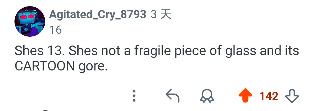 她都13岁了,又不是易碎的玻璃。而且这是卡通风格的血腥场面。