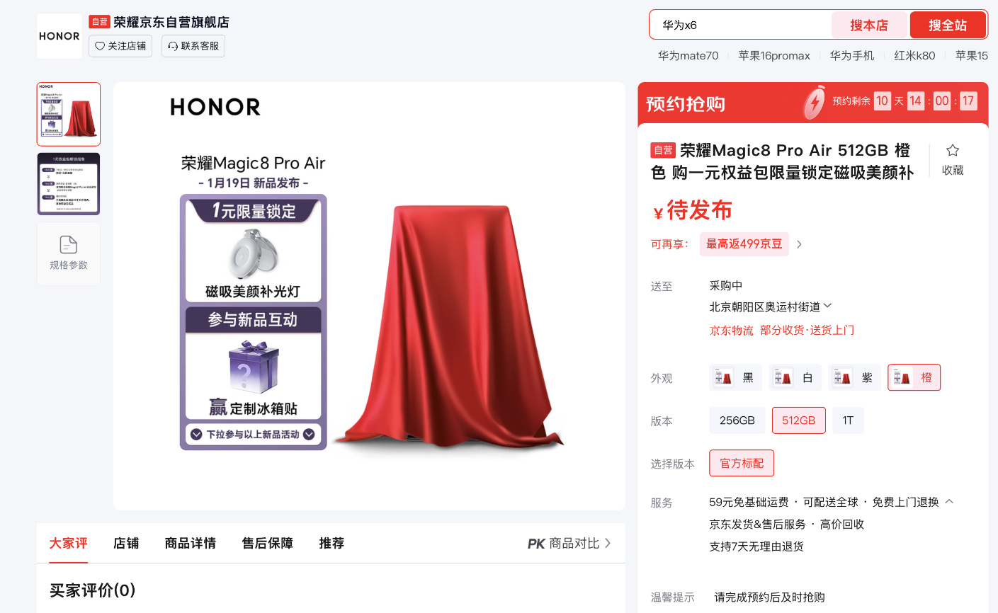 目前京东自营旗舰店已开启预约,提供黑、白、紫、橙四款配色及256GB、512GB、1TB三种存储规格选择,试图以「既 Pro 又 Air」的差异化定位,回应市场对轻薄旗舰的期待,重新定义Air品类产品的可能性边界。