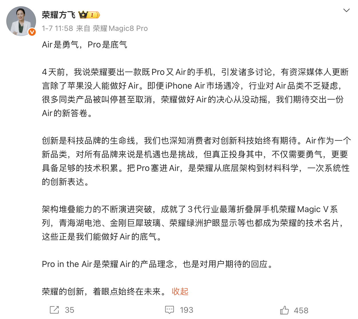 荣耀终端产品线总裁方飞强调,尽管iPhone Air市场表现未达预期、多品牌Air类产品被叫停,但荣耀始终坚定推进Air品类创新。此次新品将「Pro 级体验融入 Air 形态」作为核心目标,通过底层架构与材料科学的系统性突破,实现「Pro in the Air」的产品理念革新。