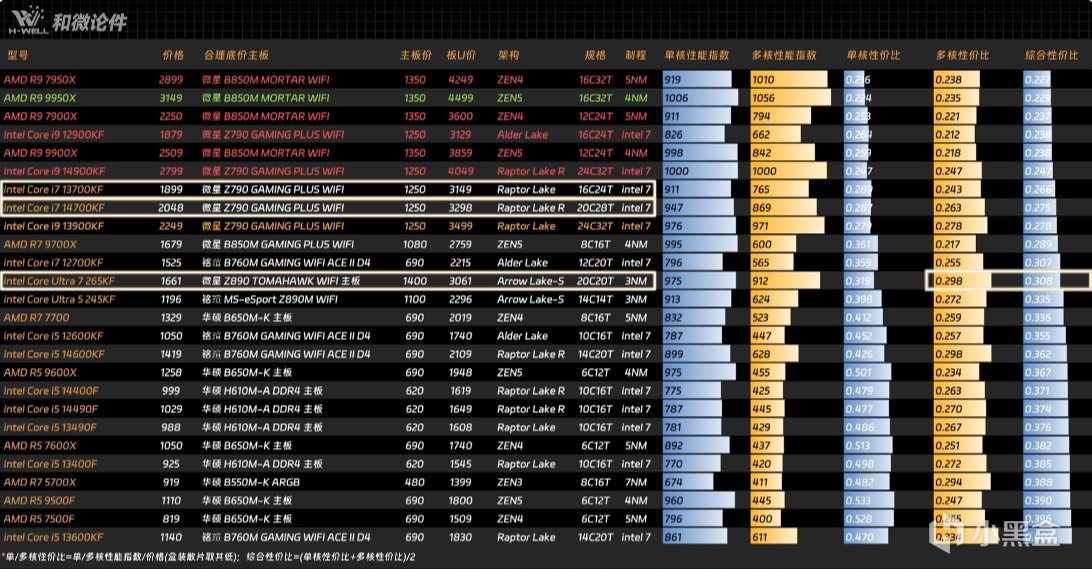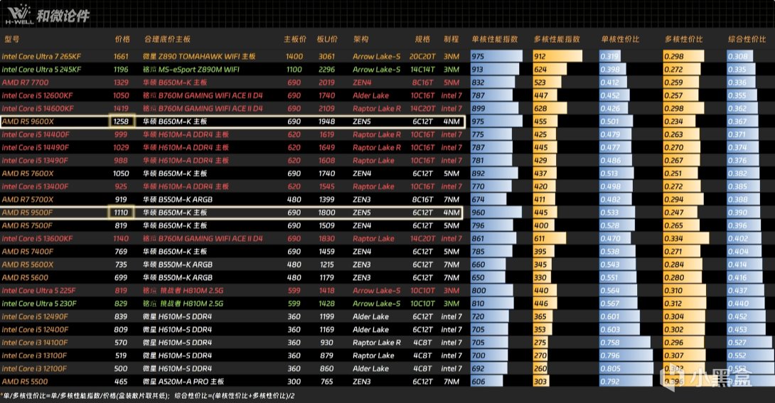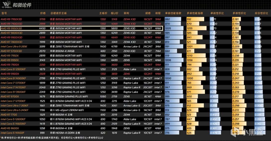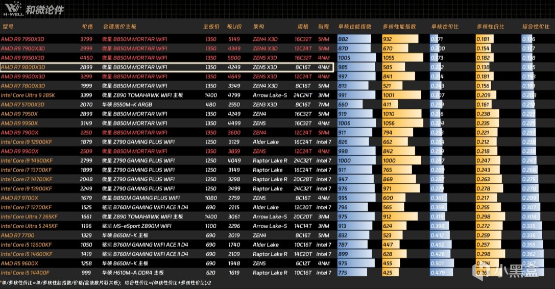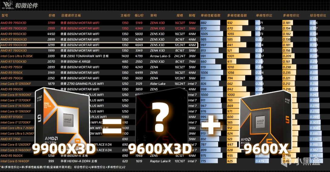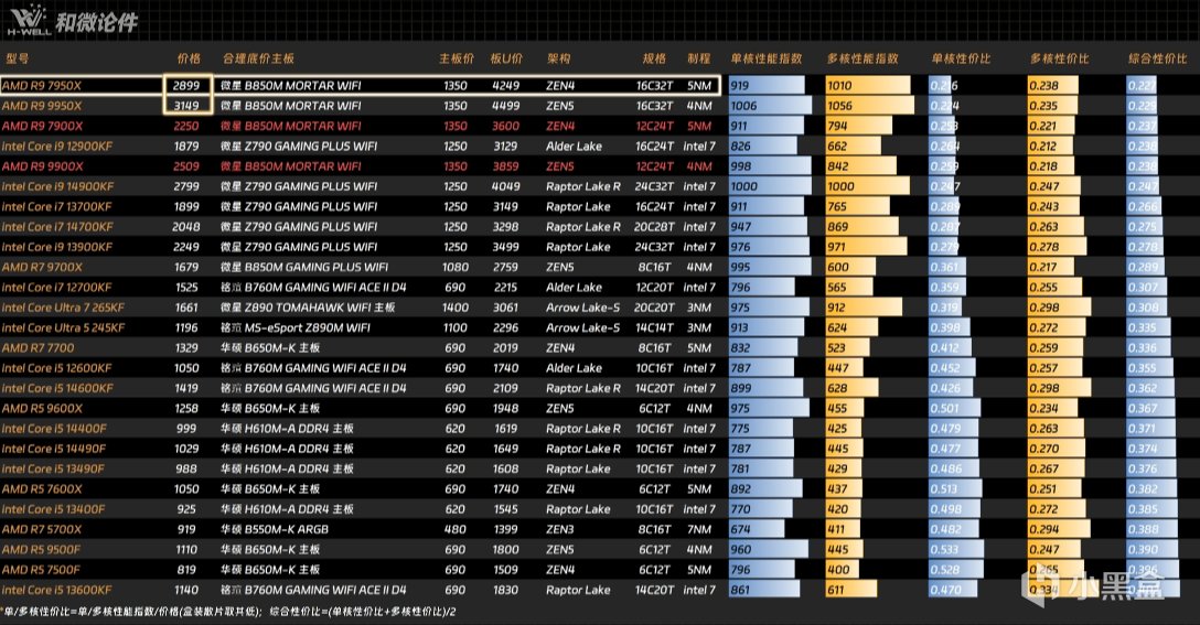 顺便在这里把后面的几个R9不带50一起说一下吧。其中9900X3D情况跟7900X3D都差不多,6核双CCD,定位尴尬,不带X3D的9900X、7900X,则是基本不怎么产出了,价格还在高位,现阶段性价比被265K锤得有点狠。所以不推荐入手。
