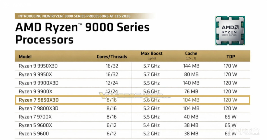 AMD这边的两个新U,先说9850X3D,在核心线程数相较9800X3D没有变化的情况下,把频率提升到了5.6Ghz,开个PBO的话,能去到5.8Ghz,这个频率在往常只能用分体水压缩机才能达到,体质提升应该是较大的,不知道内存频率能不能够普遍稳上8400
