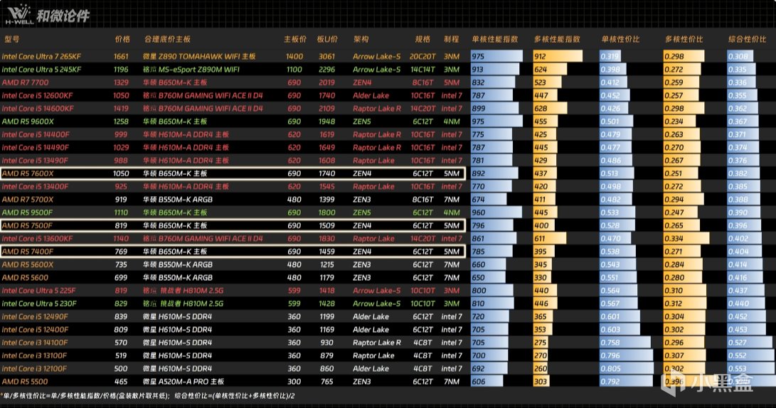 然后看看R5 7600X,这颗U,跟7500F,7400F一起讲,7600X已经比9500F还贵了,性能有代差,价格还差不多,肯定是不能碰的,7500F价格820左右,7400F则是770左右,差价不大,7400F有个缺点,核心与CPU顶盖之间为硅脂相连,导致积热问题更为突出,差价50的话,还是75F更香,如果差价在100左右,才考虑7400F。