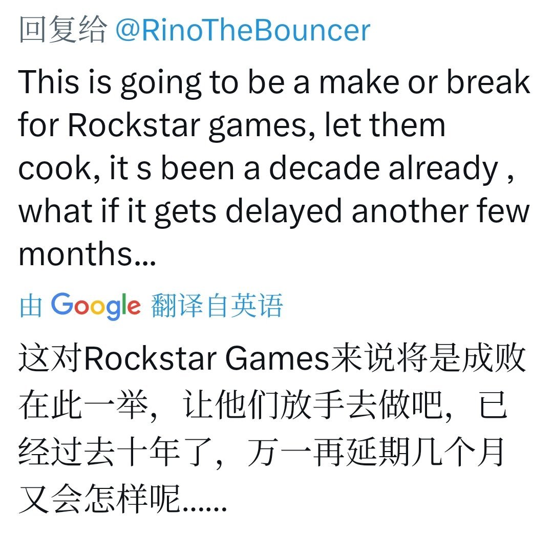 网友对此表示:这对Rockstar Games来说将是成败在此一举,让他们放手去做吧,已经过去十年了,万一再延期几个月,又会怎样呢…没关系——是的,我也很想玩这款游戏,但他们以提供高度精良的游戏体验而闻名,所以我说让他们慢慢来。今年我们有很多游戏即将推出。