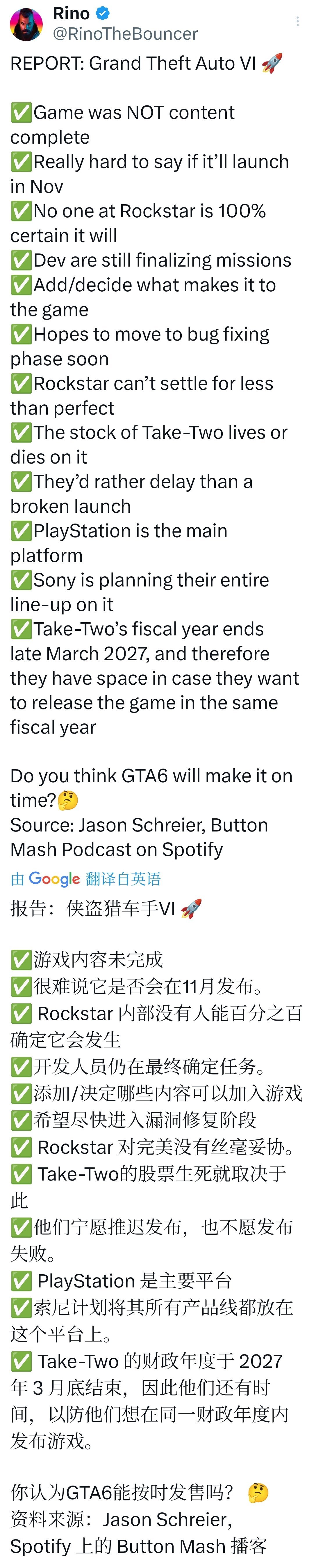 对比RDR2:RDR2从2017年宣布,到2018年10月发售,经历了多次跳票。Schreier认为GTA 6类似,“Rockstar宁愿延期也不愿半成品上架”。对11月19日的信心:“Rockstar内部没人能100%保证不会再延。但这个日期比之前的2025年秋季和2026年5月要真实得多。”Rockstar母公司Take-Two的财年到2027年3月,有缓冲空间,但每次延期其股价都会暴跌10%。