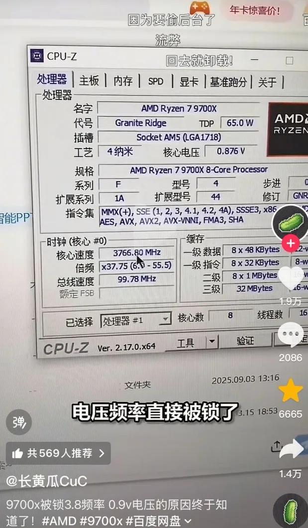 最近抖音有用户 @长黄瓜CuC 分享视频表示在使用百度网盘时,其电脑的 CPU 频率被锁定在 3.8GHz,电压降至 0.9 V,导致系统整体性能大幅下降。