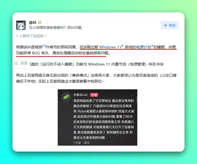 不过有网友表示自己的百度网盘并没有这个 “兼容模式”,也有网友在知乎发文表示实际上百度网盘这次算是躺着中枪那位!原因可能应该跟近期 Windows 11 系统的电源计划的睡眠、休眠功能异常 BUG 有关,偶发处理器自动锁定基础频率问题。
