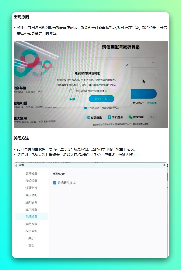 至于有些网友表示自己的百度网盘并没有这个 “兼容模式”,只有百度网盘出现闪退卡顿无响应问题,就会判定可能电脑系统/硬件存在问题,就会弹出「开启兼容模式更稳定」的弹窗。