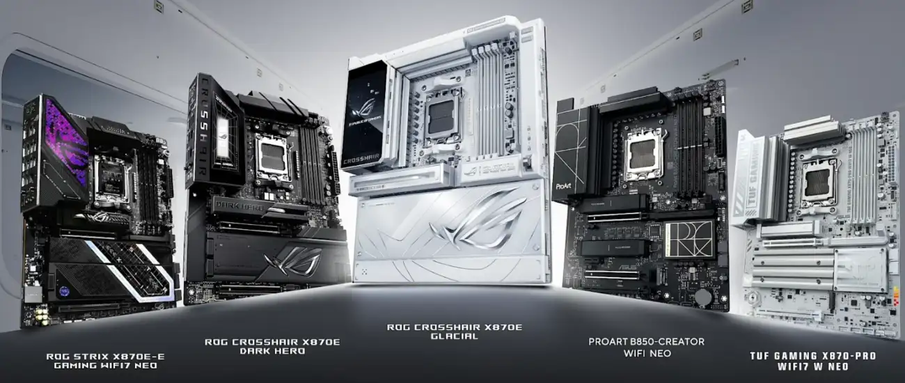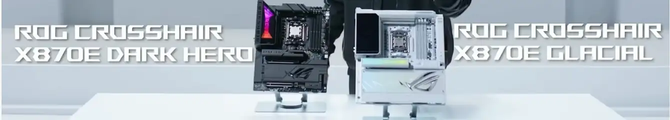 然后是两块新的纯血主板,X870E DARK HERO,以及X870E GLACIRL(EATX旗舰主板)据说有类似爱国嘉的X3D额外优化,支持无线水冷,GLACIRL填补了ROG AM5 没有纯白旗舰的遗憾(甚至没有纯白X870E),DARK HERO则是正式回归