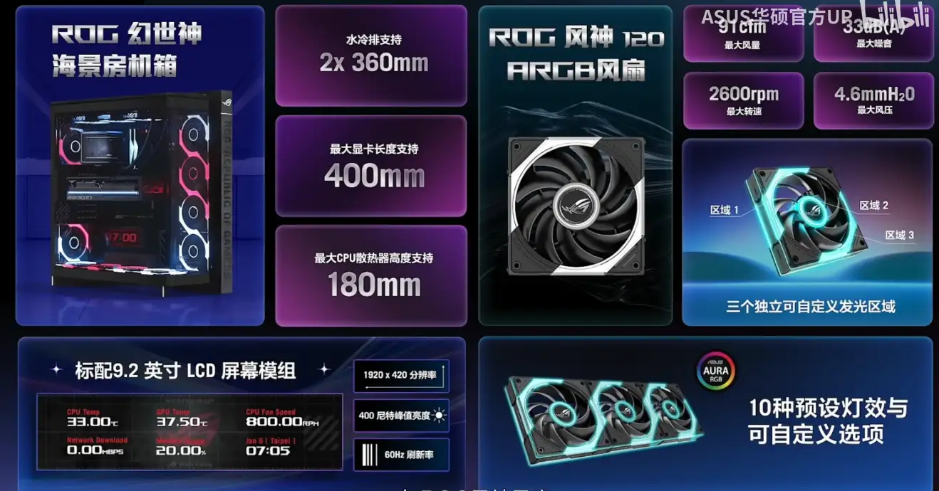 华硕先是发布了ROG系列的四代飞龙,360水冷散热器,长管短管尺寸都有,5.08英寸LCD屏幕,冷头无需连接线(需要主板支持),短管版本搭配BTF主板,显卡可以做到正面无线,颜值非常高
