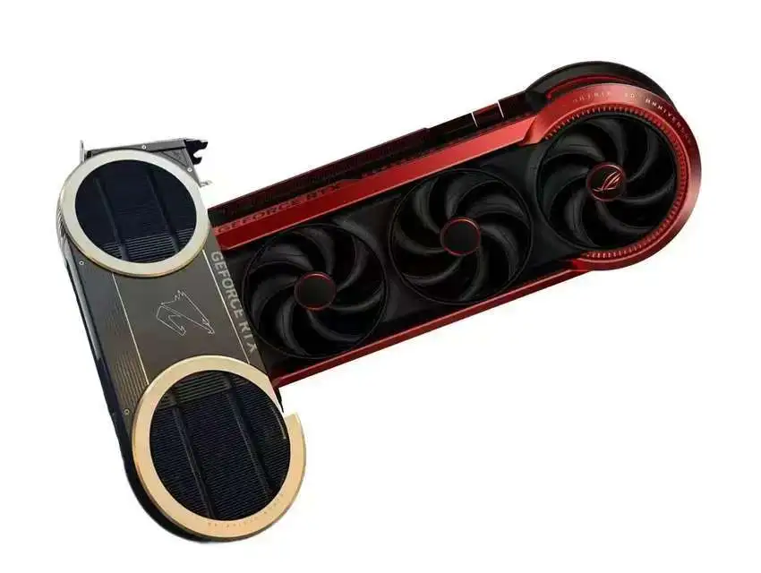 实物效果很不错,没有选择看齐其他两家,依然是一体水冷卡,双 16-pin 12V-2x6 供电接口,可以跟GODLIKE主板,AI 1600T电源组成超神全家桶
