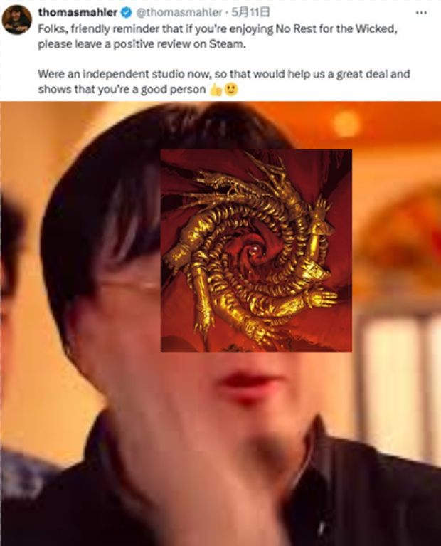 就在《恶意不息》刚开“抢先体验”(Early Access)那会,游戏因为过于硬核、完成度差等因素,遭到了玩家的差评轰炸。结果,托马斯选择的沟通方式,竟是抱怨“过多的差评可能会让工作室关门”。而另一句“帮助我们会证明你是个好人”的求助,更是毫无诚意,并把“打差评”的玩家推到“坏人”那边——毫无意外地,他干崩了Steam游戏评价。