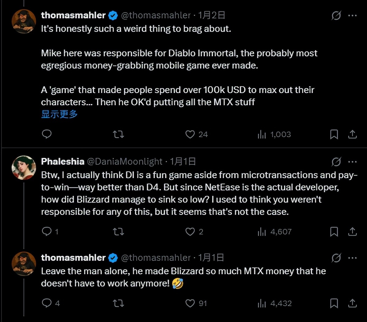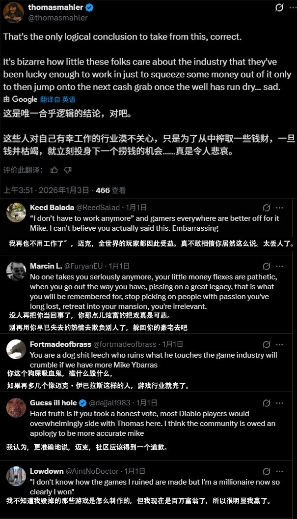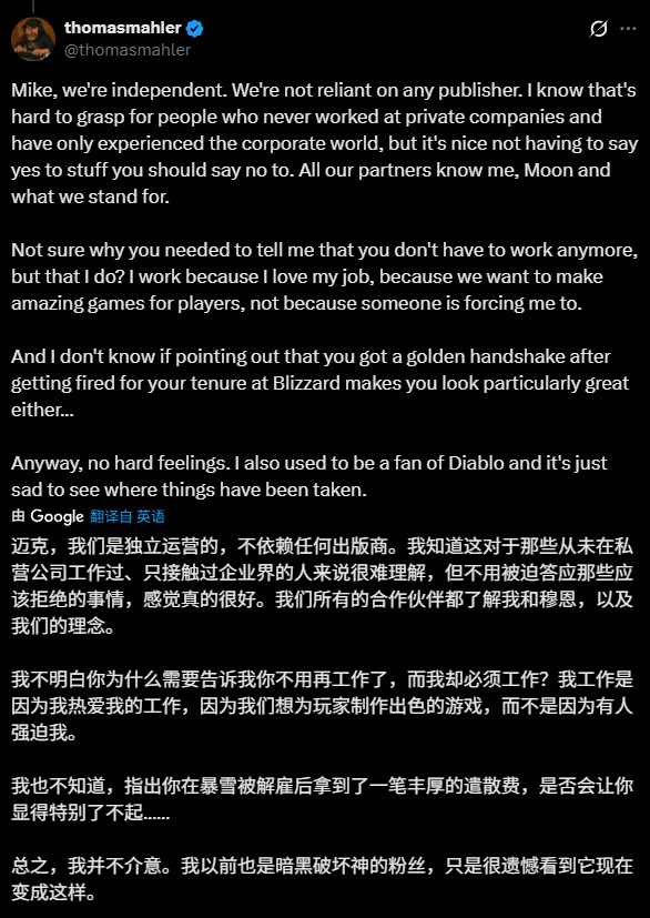 可惜,没有第三回合,因为前暴雪游戏总监不再回应。但《恶意不息》的制作人托马斯却越想越气,连带与吃瓜群众的互动,后面又连着发了多条回应。