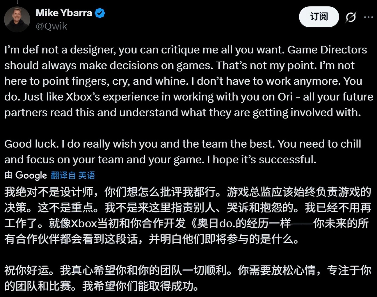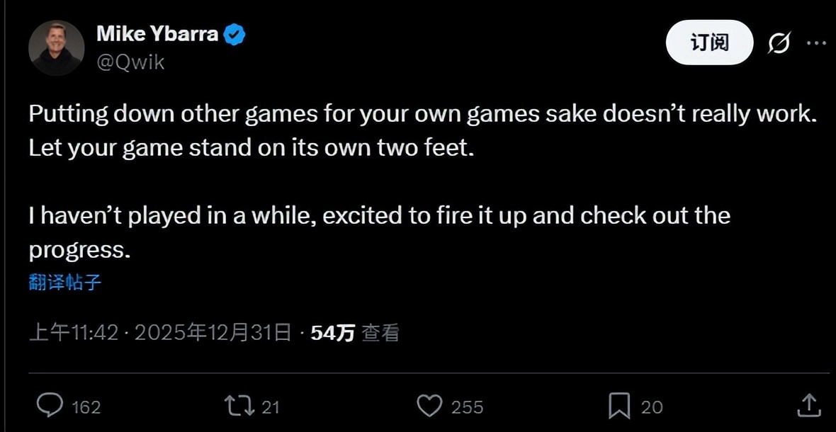 迈克·伊巴拉(Mike Ybarra),微软游戏的前副总裁,暴雪娱乐的前游戏总监,也是《暗黑破坏神4》的负责人。他劝托马斯少说两句:“贬低别人的游戏,并不会让自己的游戏变得更好”。