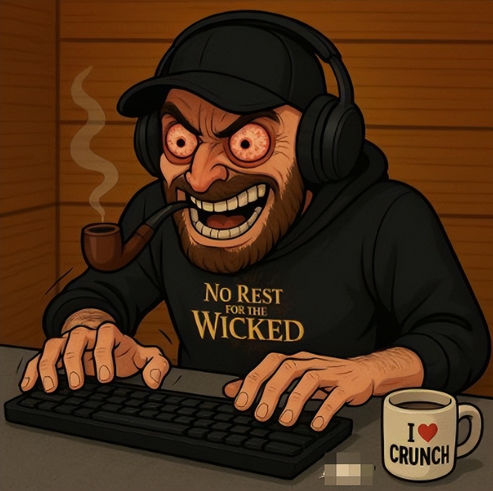 他的账号头像,画的便是一个狂暴输出的“键盘侠”。而马克杯上的英文单词更是表现着他“乐子人”的混沌体质:Crunch是打枪游戏里“蹲点阴人”的意思,用中文互联网骂战的名词翻译,就是“钓鱼”——一个人故意说“蠢话”,吸引钓上来的鱼红温、破防、出丑。