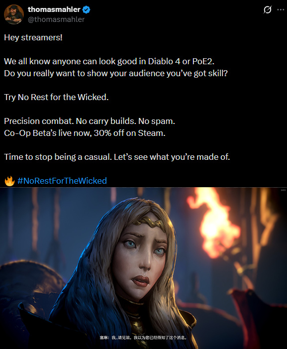这位叫“托马斯”的哥们,为宣传游戏发了条推特,意思就是《暗黑破坏神4》和《流放之路2》手残都能玩,真正的技术党应该来玩《恶意不息》——好强的“社区婆罗门”味,一个游戏制作人,竟然在公开拉踩竞品游戏?