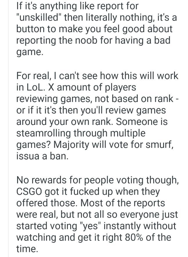 说真的,我看不出这在《英雄联盟》里怎么能行得通。让X数量的玩家来复核对局,不基于段位——或者如果基于,那你只能复核你自己段位附近的对局。有人连续多场对局都是碾压?多数人会投票判定为炸鱼,然后发出封禁。