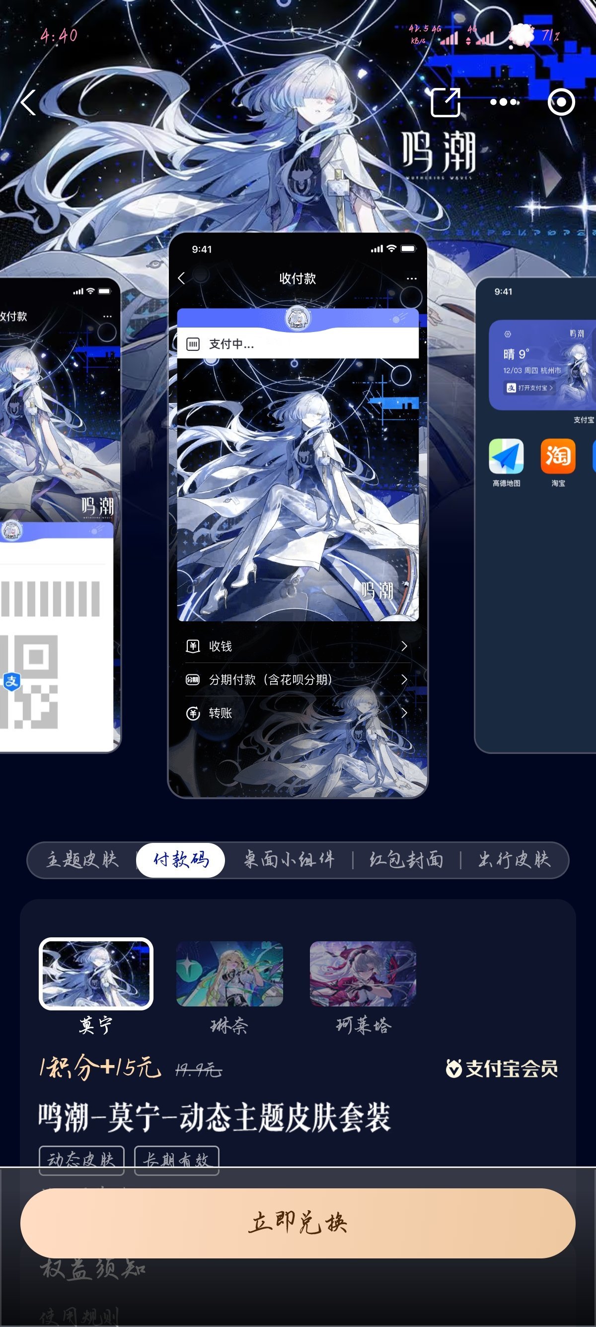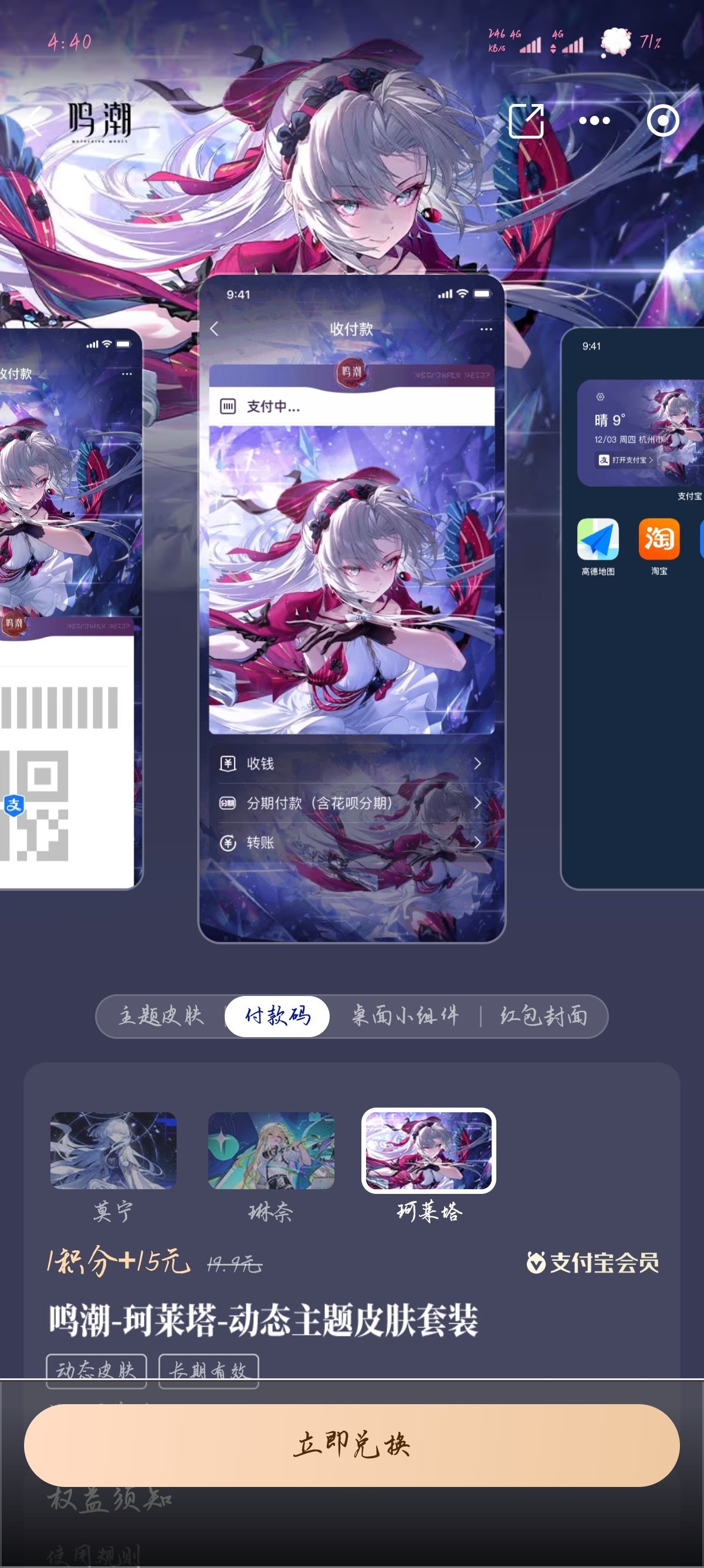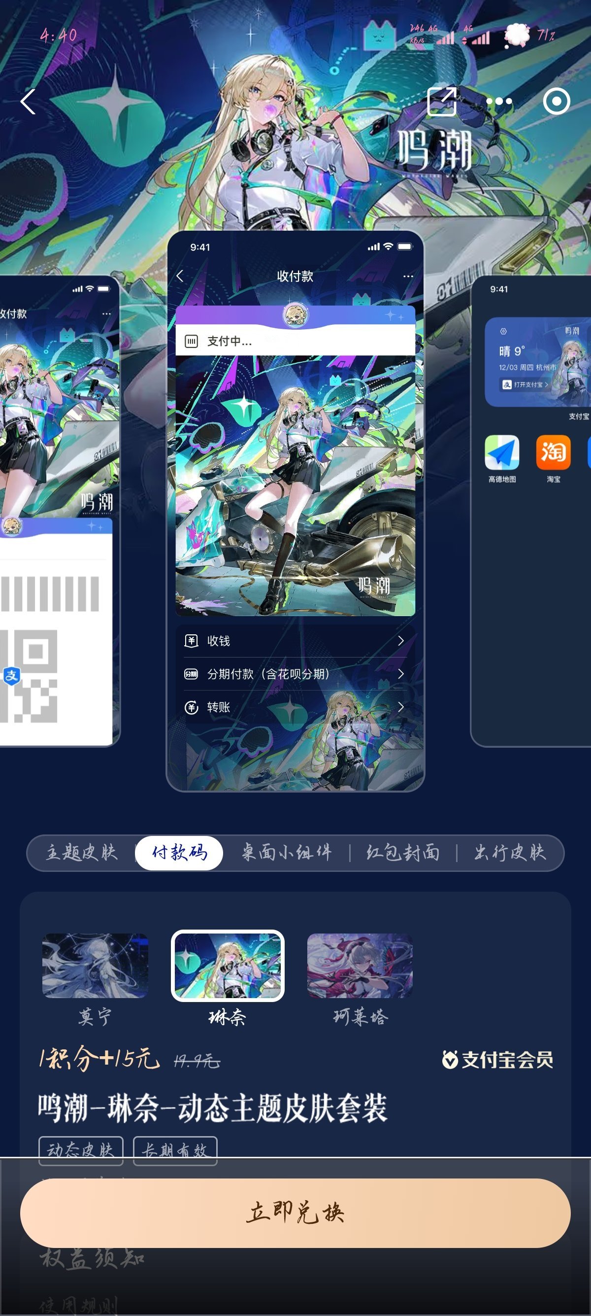 話不多說,支付寶鳴潮皮膚上新了,依舊是15塊錢永久解鎖,下面是圖片。