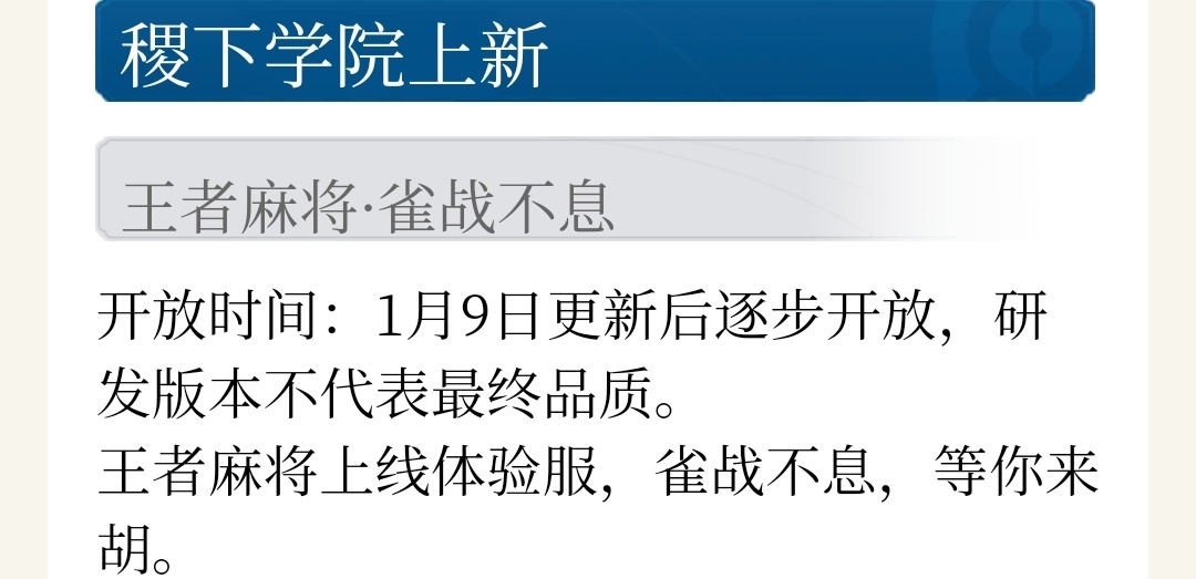 《王者荣耀》体验服于2026年1月9日更新后,在多人社交地图稷下学院上线全新娱乐玩法“王者麻将·雀战不息”。玩家可以匹配路人快速开局,或邀请好友组局娱乐,支持4人一桌。玩法严格遵循四川麻将血战到底规则,结合王者特色结算系统,使用专属货币福豆进行对局计分。这不是传统一胡赛过,而是血战到底:一家胡牌不会结束游戏,继续打到三家胡牌或牌堆耗尽才结算。适合休闲娱乐,同时考验算牌、听牌和策略。