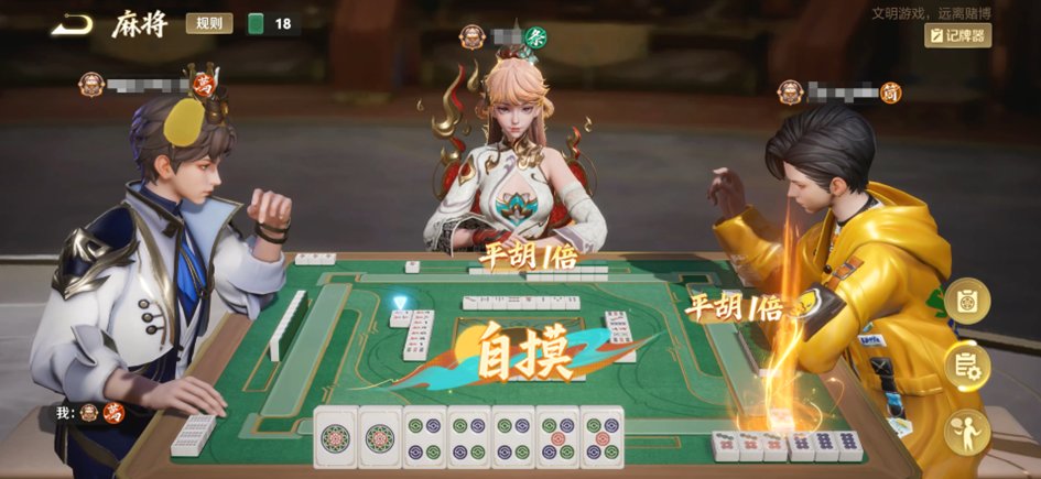 每场对局中,一家胡牌不会结束游戏,直到三家胡牌或者牌堆耗尽。对局开始时,依次进行“换三张”——选择3张同花色的手牌,按逆时针顺序进行交换、“定缺牌”——选择1门花色作为本局缺门,胡牌时手牌中不能含有此花色的牌。